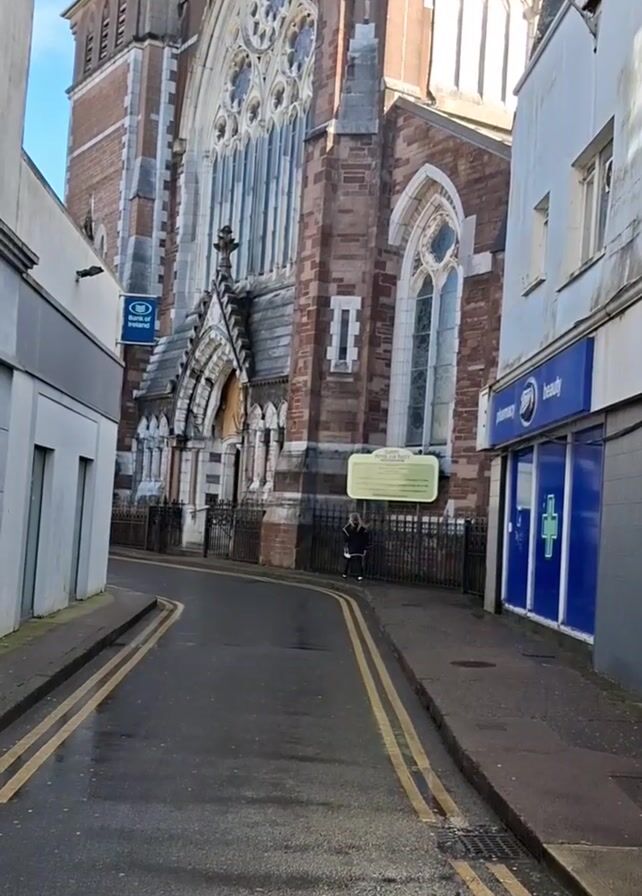 narrow street with a tall brick church on the right side. The church has a large rose window and a spire on top. A person is walking down the street in front of the church. There are buildings on either side of the street, including a pharmacy. The sky is blue with some clouds. The street is wet and has double yellow lines down the center. There is a streetlamp hanging above the street. There is a sign on the side of the church.