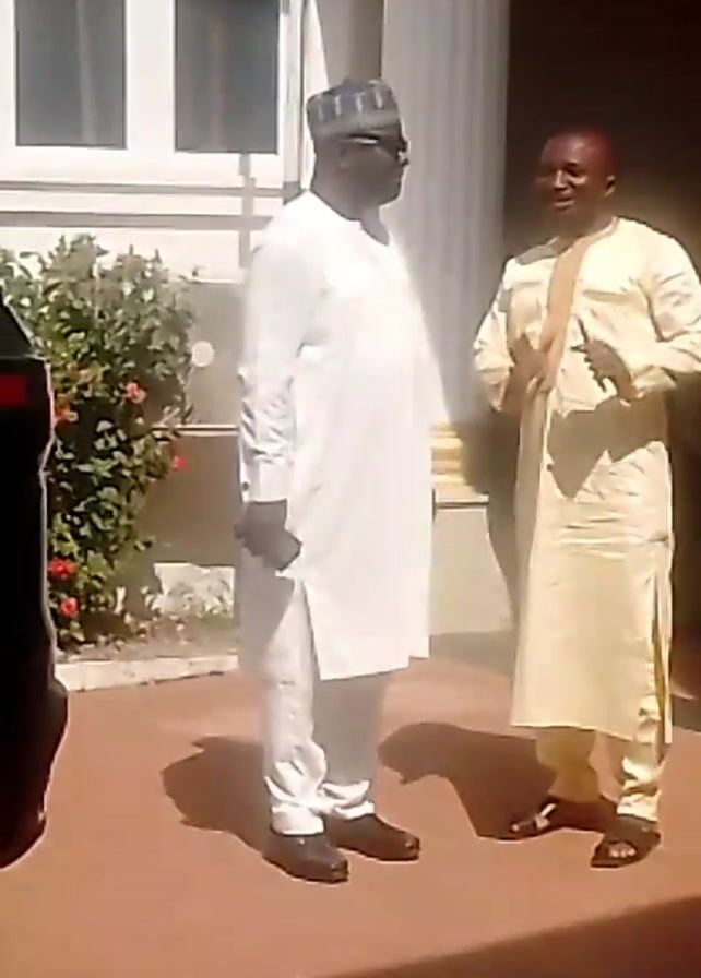 Two men are standing on a brick patio, talking to each other. The man on the left is wearing a white outfit and a small cap. The man on the right is wearing a light yellow outfit. After a brief conversation, the man in white walks toward the back of a dark car, where a third man is standing. The background includes a white building with windows, a column, and a small bush with red flowers.