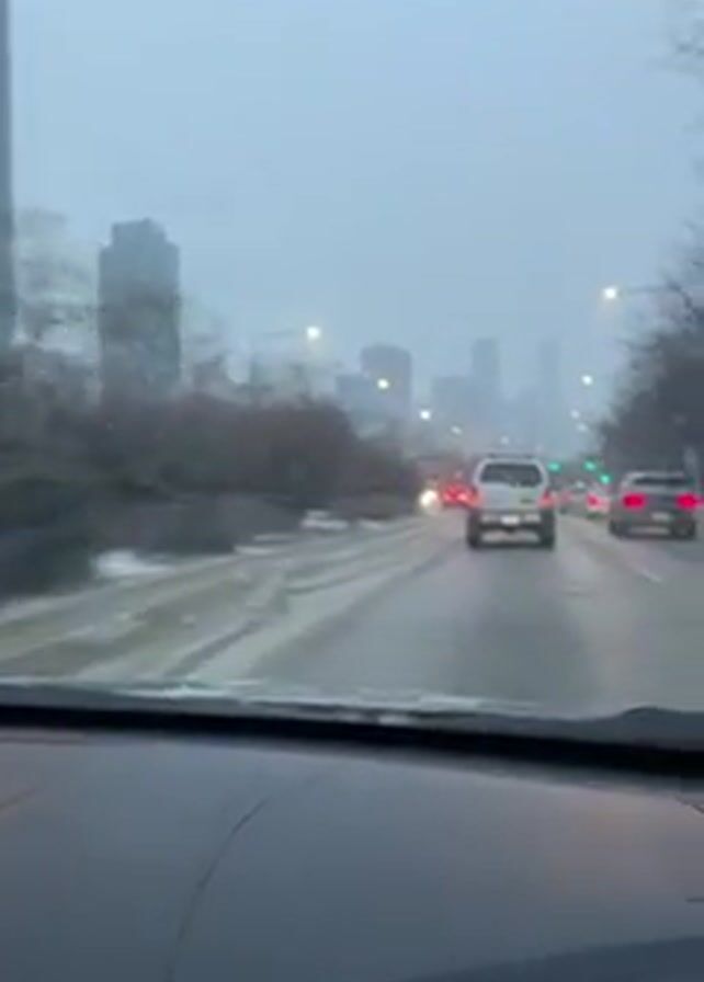 car's dashboard and the road ahead through the windshield. It is a gray, overcast day in a city. The road is wet, and there is snow on the side of the road. Cars are driving on the road, and in the distance, tall buildings of the city skyline are visible.