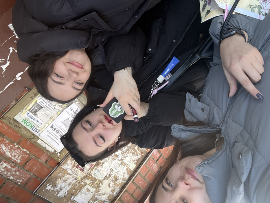 Three females are depicted in a close-up, selfie-style image against a brick wall adorned with weathered paper advertisements. The scene is illuminated by natural light. The individual in the foreground on the left has brown hair and wears a grey puffer jacket. Her left hand, featuring dark-painted fingernails and a black smartwatch, is visible in the lower right, positioned near a patterned fabric. The central individual has dark hair with sunglasses resting on her head and wears a black jacket. She is actively applying dark red liquid lipstick to her upper lip, using a small black compact mirror or device with a green and white skull-and-foliage sticker on its reverse. A small stud nose piercing is visible on her left nostril. A black shoulder bag is partially visible on her right, from which a keychain with a pink and white cord and a blue tube labeled "VOIS" is suspended. The third individual, positioned on the right and partially obscured, has dark hair and wears a black puffer jacket. She smiles directly at the camera, resting her head against the shoulder of the central individual. The background consists of a red brick wall covered with multiple layers of aged, torn, and overlapping paper posters and flyers. Visible Cyrillic text fragments include "ОБЛАКОМ" and "РОВКА ВАНН," along with a partial phone number beginning "8(916)." The outdoor setting, combined with Cyrillic script, places the scene in Dmitrov, Russia.