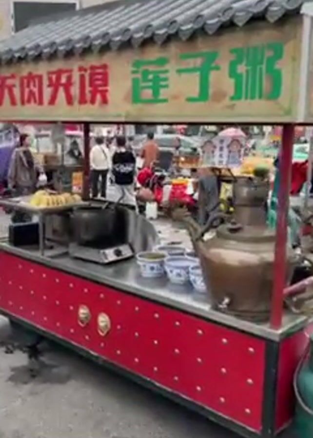 street food carts in an outdoor setting. One cart is red with gold accents and a tiled roof, with text in Chinese characters. It has a large metal pot on a burner, small bowls with food items, and a brass teapot-like dispenser. Nearby, another cart has an umbrella and is selling corn. People walk around the carts and other carts are in the background, creating a bustling market atmosphere.