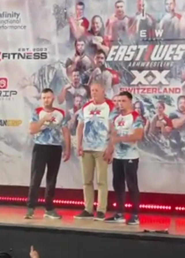 Three men stand on a stage in front of a backdrop for East West Armwrestling XX in Switzerland. All three men are wearing matching short-sleeved shirts with white and blue swirls and a red logo. The man in the center is older, wearing khaki pants and sneakers. The two men on either side of him are younger, wearing dark pants and sneakers. The man on the right walks away. Red lights are lining the front edge of the stage. There is a partial view of the audience.
