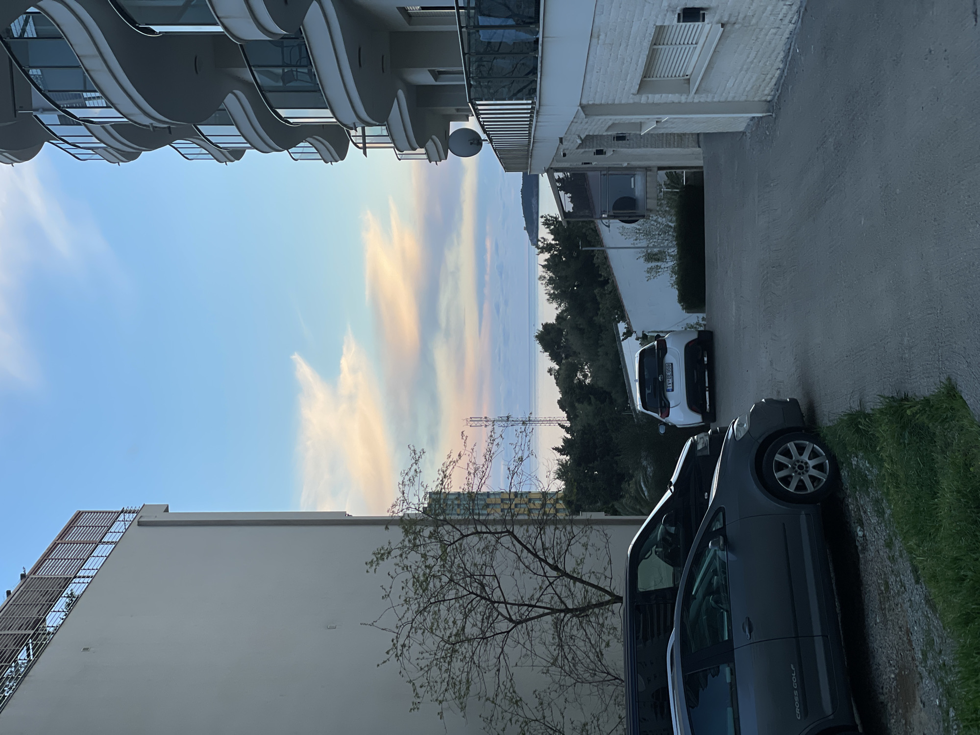 street scene in Boreti, Montenegro. Buildings line either side of a narrow asphalt road. On the left is a large, light-colored apartment building with multiple balconies and a metallic grid structure visible on the side. A bare tree is in front of it. On the right is another building, white with visible windows, and a narrow strip of greenery. Two cars are parked on the road: a gray "Cross Golf" is closest, partially obscuring a white van further down the road. The sky between the buildings shows a colorful sunset with vertical stripes of pink, yellow, and blue. A cellular tower is also visible in the distance.