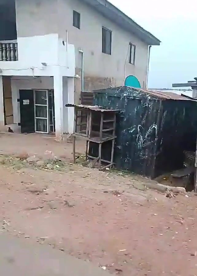The video depicts a street scene in a rural or developing area. Several buildings with simple architecture are visible, along with dirt roads. Various motorcycles are parked along the side of the road. A man is seen standing next to a motorcycle. There are signs for local businesses, including one for agricultural and veterinary services. The sky is overcast, suggesting a potentially rainy day. The overall impression is of a somewhat impoverished area with basic infrastructure.