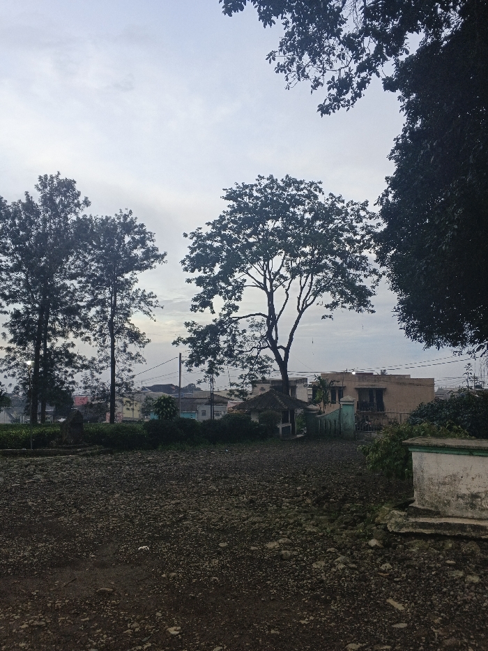 The image depicts an outdoor, unpopulated scene within the city of Kon Ra Kiah, Vietnam, under an overcast sky. The foreground comprises an expanse of dark, uneven ground covered with rocks and dirt. To the immediate right, a weathered, rectangular concrete structure, partially painted white and green, is visible. A line of dark green shrubs forms a boundary across the midground. Behind these shrubs, on the left, two tall, slender trees with dark foliage stand next to a utility pole bearing a luminaire. In the center-right, a larger tree with a full, dark canopy and visible branches dominates. Behind this tree, a small, open-sided structure with a dark, peaked roof, resembling a gazebo, is situated. Further in the background, a light-colored, multi-story building with multiple windows and balconies is visible. Additional distant buildings of various colors are discernible, suggesting a populated area. Overhead, utility lines traverse the cloudy, light grey sky. No individuals or specific activities are present.