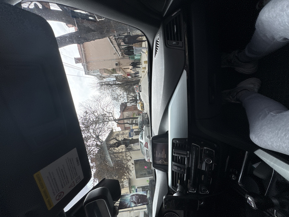 The image presents a street view in the city of Montana, Bulgaria, captured from the passenger's perspective inside a vehicle. The sky is overcast. Inside the vehicle, the lower portion of the frame displays the dashboard, characteristic of a modern car (e.g., BMW), with a central infotainment screen showing a digital interface. A smartphone is vertically mounted on the left side of the dashboard. The legs of a passenger are visible below the dashboard, clad in light grey sweatpants and light-colored athletic shoes. The top edge of the frame is defined by the vehicle's dark headliner and a deployed sun visor displaying a warning label. Outside the vehicle, a two-lane paved street extends into the background. A white Mercedes-Benz sedan is visible on the right side of the road, followed by other vehicles, including several yellow taxis further down the street. A concrete sidewalk runs along the right side of the street, where multiple pedestrians are observed. In the foreground on the sidewalk, two men are prominently featured: one wearing a dark hoodie and light-colored pants, and the other in a dark jacket and dark pants. Buildings, primarily multi-story structures with varying facades, line both sides of the street, some with visible commercial establishments at ground level. Bare deciduous trees are interspersed along the street, indicating a cold season.