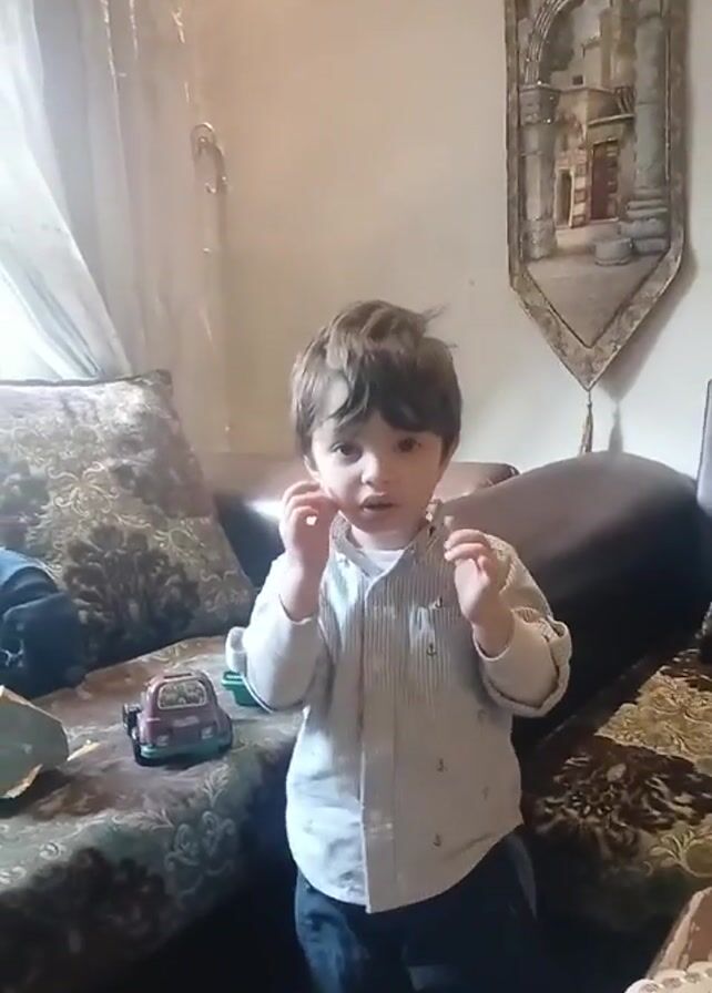 A young boy with dark brown hair wearing a striped button-up shirt and dark pants stands in front of a brown couch with patterned cushions. There's a small toy car and a green bucket on the couch next to him. A wall hanging with a picture on it is visible on the wall behind the couch. The boy briefly brings his hands to his face and then turns to look to his right.