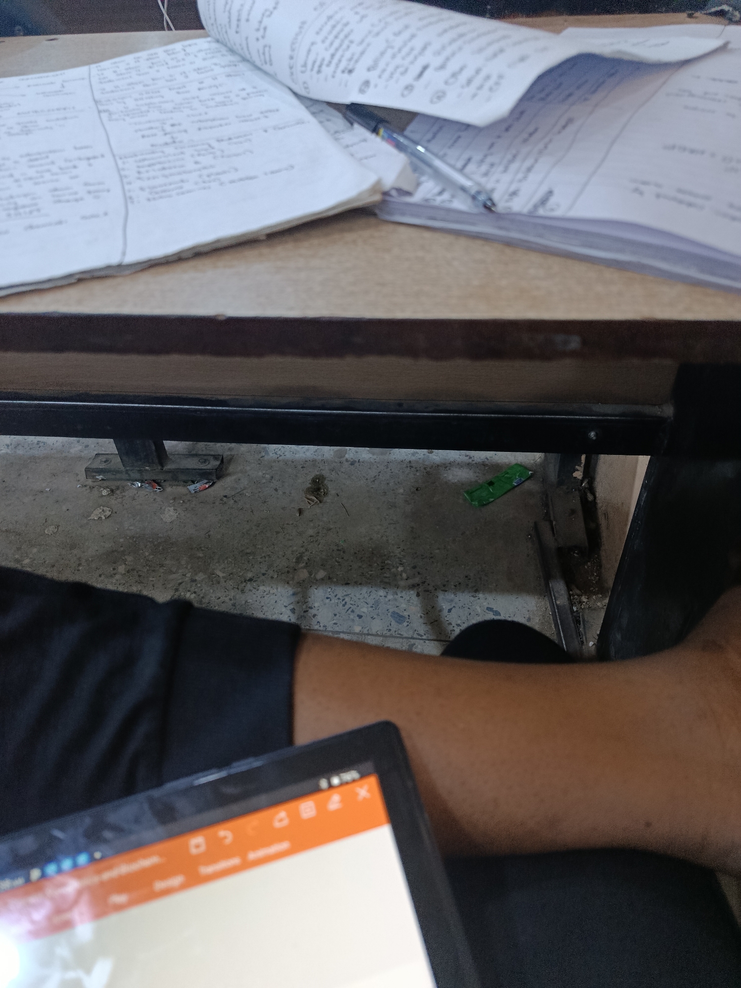 A partially-visible person wearing black attire is seated at a desk, with a pen and open notebooks containing handwritten notes placed on the desk surface. A partially visible electronic device, possibly a tablet or laptop, is in the foreground. The environment is a room with a view of the floor under the desk, revealing debris and a discarded package. The location is Unknown, Nigeria.