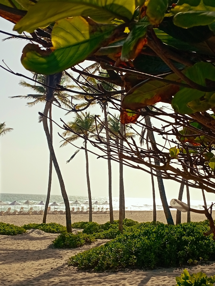 The image depicts a static scene on the beach at Playa El Agua, Venezuela, observed through the dense foliage of a foreground tree. The foreground is dominated by large, green and partially reddish-brown leaves and a network of bare branches, some illuminated by sunlight from the upper right, casting shadows. Below this foliage, a sandy path or area with distinct shadows leads towards the beach. Low, dense green bushes are interspersed throughout this sandy zone, arranged in beds or along pathways. Several tall, slender palm trees with brown trunks rise vertically from the sandy ground, extending into the sky, some partially obscuring the view of the beach. In the midground, beyond the palm trees and sandy pathways, a wide expanse of pale sand forms the beach. Arranged in at least two visible rows, numerous white beach umbrellas are uniformly spaced, each accompanied by one or more light-colored lounge chairs. No individuals are visible occupying these chairs or walking on the beach. The background features the calm, light blue-grey ocean with small, subtle waves breaking near the shore. A bright, sunlit reflection stretches across the water's surface from the right side of the frame towards the center. The sky above the ocean is a light, hazy white, indicating strong ambient light. A distinct, modern-looking light fixture, possibly cylindrical and light-colored, is attached to a tree branch on the right side of the image, extending into the frame from the right edge, just above the green bushes. No visible actions or interactions are occurring within the scene.