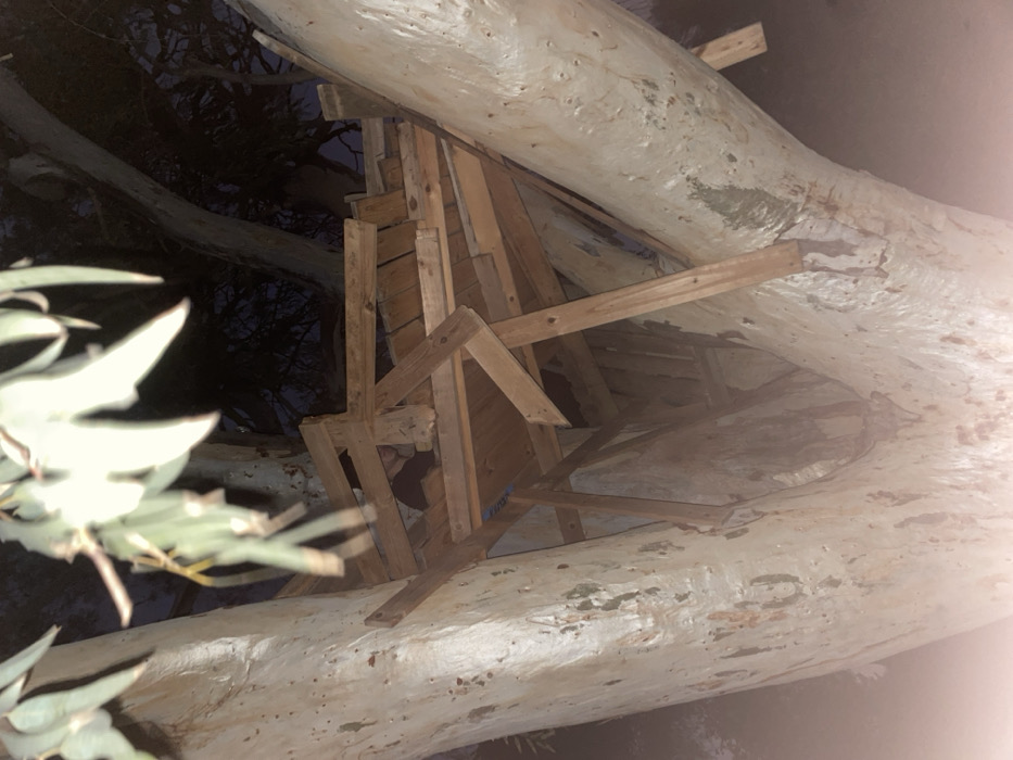 The image displays a rudimentary wooden structure, possibly a treehouse or platform, built into the crotch of a large tree with light-colored, mottled bark