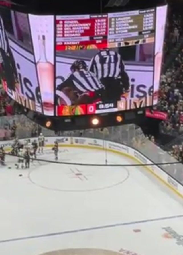 The video captures a live hockey game scene, viewed from a higher vantage point, focusing primarily on the center ice area and the large video scoreboard suspended above. The scoreboard displays various information, including player statistics, a beer advertisement, and a close-up replay of two referees seemingly resolving a situation involving a hockey player. Below the scoreboard, on the ice, several players from both teams are gathered, and the score indicates that one team leads with 4 points, while the other has 0. The arena appears to be filled with spectators.