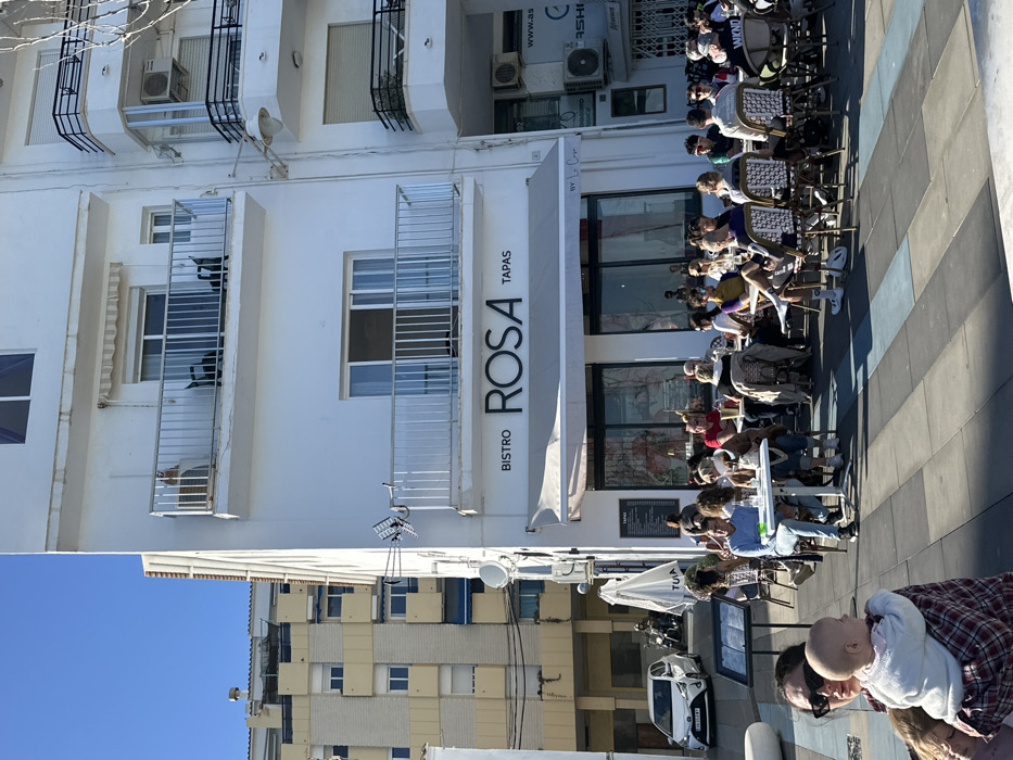 The image depicts an outdoor cafe scene on a sunny day in Altea, Spain. The prominent structure is a multi-story, white-facade building, with "BISTRO ROSA TAPAS" occupying the ground floor. This establishment features large glass windows and a grey retractable awning, beneath which numerous patrons are seated at outdoor tables on a patterned tiled pavement. The building's two visible upper floors each have a balcony with white metal railings and sliding glass doors; a light-colored feline is visible on the upper balcony, looking over the railing. An antenna array is mounted on the building's left side. In the foreground, a woman wearing sunglasses holds a baby wrapped in a plaid garment, with another child partially visible nearby. The cafe area is occupied by a diverse group of individuals engaged in dining and socializing at various tables and chairs. A menu board on a stand is positioned near the cafe's left edge. Adjacent to the bistro, a side street reveals a parked white Toyota Yaris (license plate 9546 LYJ) and a partially obscured motorcycle. In the background, across from "BISTRO ROSA," stands another multi-story building with a beige/yellow facade and multiple balconies. The sky is clear blue, and strong shadows indicate bright sunlight.