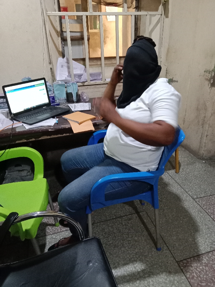 An individual is seated in a blue plastic chair at a cluttered wooden desk within an indoor setting in Lokoja, Nigeria. The person's face and head are completely obscured by a black fabric covering. They are wearing a white short-sleeved t-shirt and blue jeans. Their right hand is raised to the side of their head, appearing to adjust the black fabric. Dark open-toed footwear is visible on the right foot. On the dark wooden desk, a black HP laptop is open and powered on, displaying an illuminated screen with a white background and green interface elements. To the right of the laptop, two light brown envelopes or folders are stacked. Numerous papers, documents, and various small containers, including a clear cup holding pens, are scattered across the desk surface. In the background, a barred window with white metallic bars is visible above the desk. The light-colored walls exhibit signs of wear and discoloration. White electrical wiring runs along the upper wall. The floor consists of mottled terrazzo or speckled tiles. To the immediate left of the seated individual, a bright lime green plastic chair is visible, and in the foreground, the armrest and part of the seat of a black office chair with a metallic frame are present.