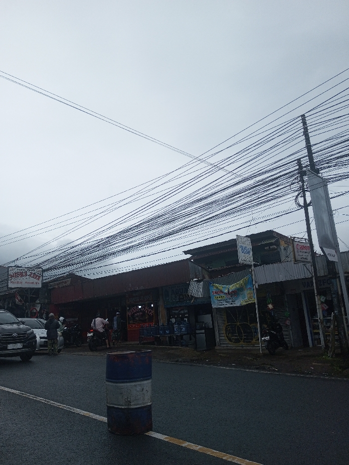 A street scene under a cloudy sky features a row of shops with various signs. An abundance of overhead wires crisscrosses the sky. People gather in front of some stores, alongside parked cars and motorcycles. A blue and white barrel stands on the side of the road, near a yellow painted line. The wet asphalt suggests recent rain.