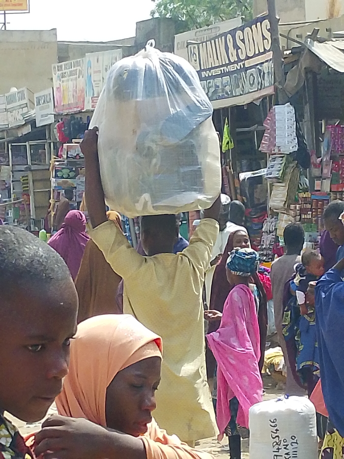 The image depicts a crowded outdoor market scene in Fagge D1, Nigeria, under bright daylight