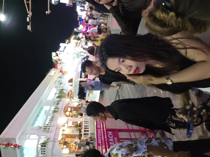A nighttime street scene displays a bustling crowd against a backdrop of illuminated buildings. The foreground is dominated by several individuals. A woman with long, dark hair wearing a black top appears prominent. To her left, a man in a black shirt looks towards the street. More figures, some blurry, are partially visible. The setting appears to be a tourist area.