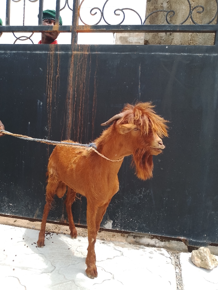 An outdoor scene in Adankolo, Nigeria, depicts a reddish-brown male goat standing on a light-colored, patterned concrete surface