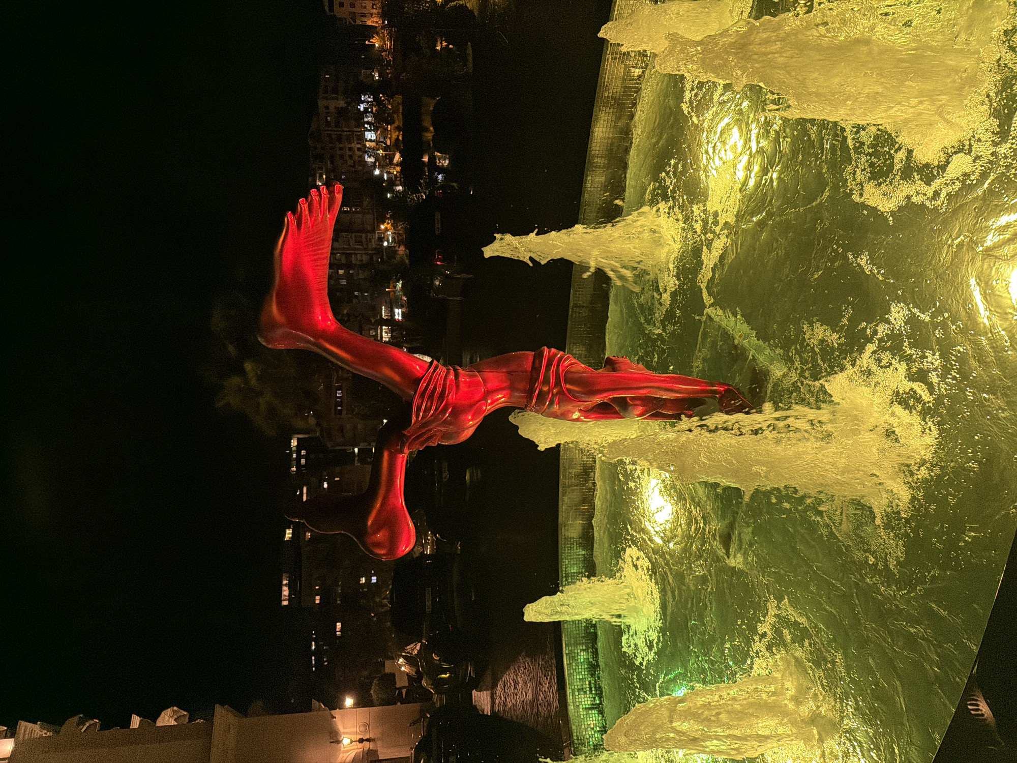 The image captures a nighttime scene in Farkë, Albania, dominated by a large, reflective, reddish-pink metallic sculpture situated within a multi-jet fountain. The sculpture depicts a stylized human figure in an inverted, hand-standing pose, seemingly plunging into or emerging from the water. The figure is headless, with prominent hands and feet. The fountain basin contains water illuminated by yellow-green lights, from which several powerful jets of water erupt upwards, creating white plumes. To the immediate left, a portion of a light-colored building with classical architectural details, including a wall-mounted lantern, is visible. The background reveals the dark outlines of numerous distant buildings with illuminated windows, indicative of an urban or suburban environment at night.