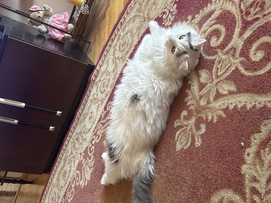 An indoor scene in Sofia, Bulgaria, depicts a long-haired cat positioned centrally on a patterned rug. The cat, predominantly white with gray and black markings on its body and face, is lying on its back with its belly exposed, limbs slightly splayed. Its head is tilted upwards towards the viewer, revealing open, yellowish-green eyes. A fluffy gray tail extends to the left. The rug, covering the floor, is reddish-orange with intricate beige and gold floral-like patterns. In the background, to the left, a dark brown wooden cabinet with two doors is visible. Each door features an elongated handle with a black central grip and pointed, metallic silver ends. To the right of the cabinet, a light-colored wooden floor is partially visible, along with a narrow, dark wooden stand upon which a light brown teddy bear is seated. The teddy bear wears a pink dress and a pink bow on its head. A yellow, conical object is partially discernible to the right of the bear on the same stand.