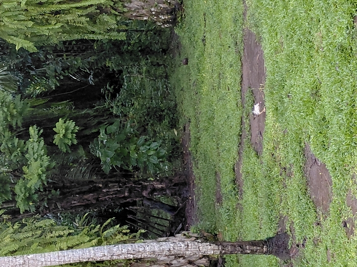 A lush, green landscape is shown, possibly after rain, with vibrant vegetation dominating the scene. A pathway of bare soil cuts through the grass. Dense foliage fills the left side, hinting at a hidden trail. A fallen tree trunk lies in the foreground. The scene is serene, depicting the tranquility of nature.