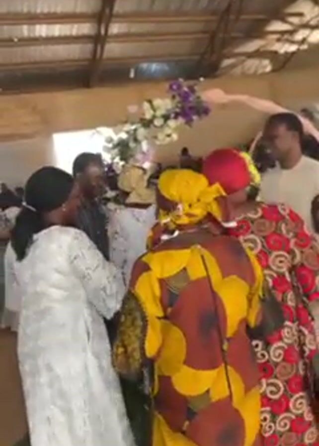 In what appears to be an indoor event space with a corrugated metal roof, a group of people are gathered around a floral archway. The archway is adorned with white and purple flowers. Among the people, several are wearing traditional African print clothing, including yellow, red, and brown patterns. There's also a person in a white lace dress. They appear to be dancing and interacting, possibly at a wedding reception or similar celebration.