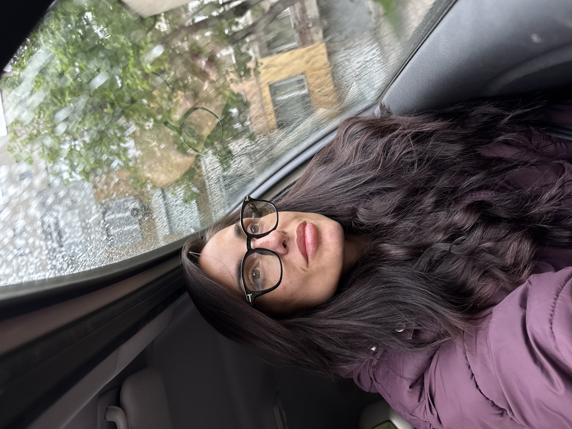 A woman is photographed inside a car. She has long, dark brown hair and wears black-rimmed glasses. She is wearing a purple puffer jacket. Outside the car window, the scene is blurred due to raindrops on the glass, but trees and a yellow building are visible. The location is likely in Pleven, Bulgaria, given the request.