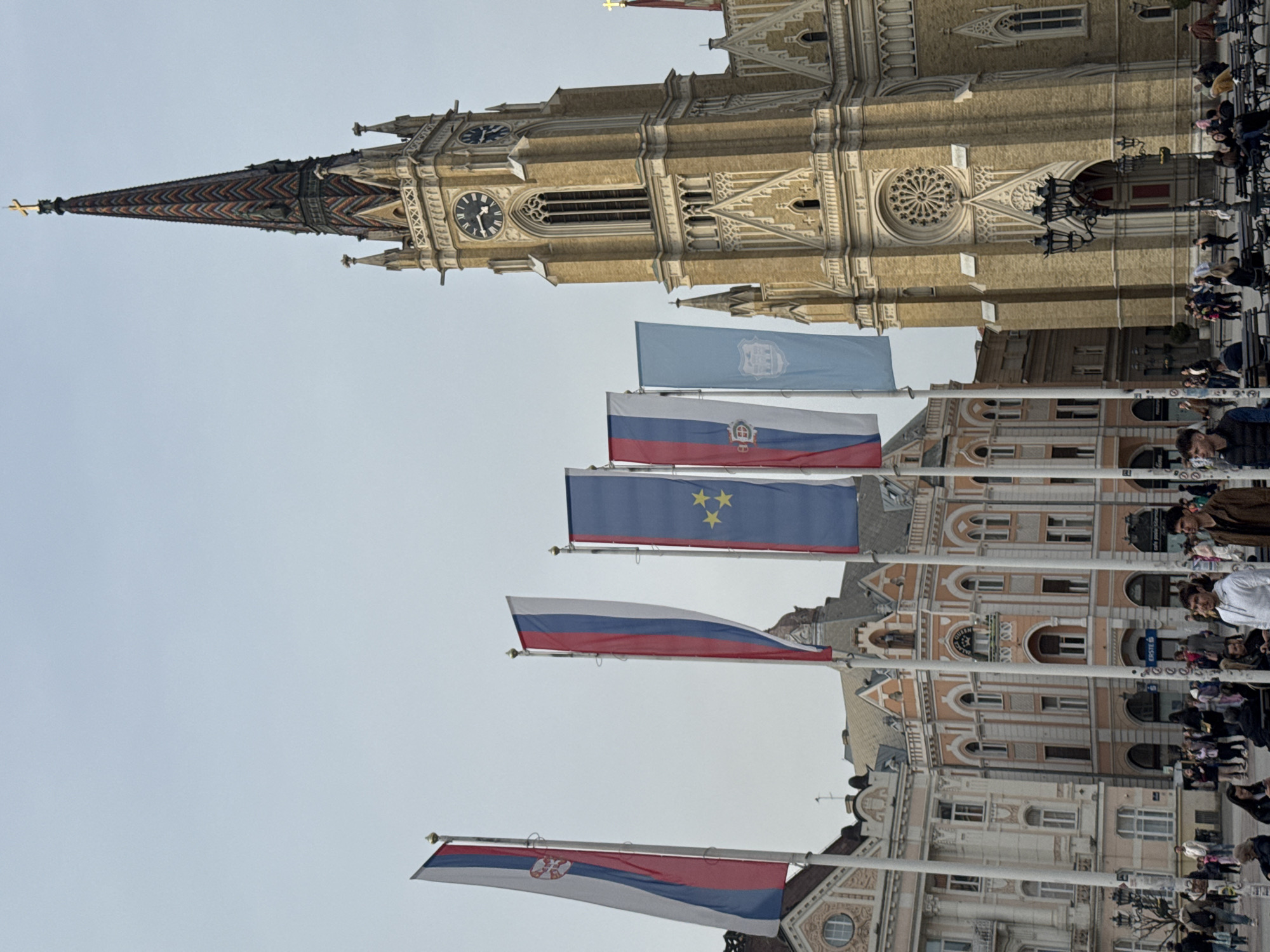 The image depicts Freedom Square (Trg Slobode) in Novi Sad, Serbia, under an overcast sky. The central and dominant feature on the right is the Name of Mary Church (Katedrala Ime Marijino), a Gothic Revival structure constructed of light brown brickwork. Its tall, slender spire is covered with a distinctive patterned roof of multi-colored ceramic tiles (red, orange, blue, green, black) arranged in a chevron design, topped with a golden cross. The church tower features multiple clock faces, with one visible showing approximately 11:55, and a large circular rose window with intricate tracery on its facade. In the mid-ground, extending from the left to near the church, are six vertical banner flags on poles. From left to right: a Serbian flag with the lesser coat of arms; a plain Serbian flag; a blue flag with three yellow stars and a vertical Serbian tricolor stripe at the hoist (flag of Vojvodina); another plain Serbian flag; a light blue flag bearing a white coat of arms (flag of the City of Novi Sad); and a partially visible flag, likely another Serbian one, behind the church. Behind the flags on the left, an ornate multi-story building with a cream-colored facade and decorative elements stands. Adjacent to it, another multi-story building with a peach-toned facade, white trim, arched windows, and a prominent corner section is visible, with an "ERSTE" sign on its ground level. The foreground and mid-ground of the square are populated by numerous individuals. People are seen walking, standing in small groups, and seated on dark public benches arranged across the paved square. Their attire is casual, suggesting temperate weather. Black, ornate street lamps are positioned throughout the square. The overall scene is a busy urban public space during daytime.