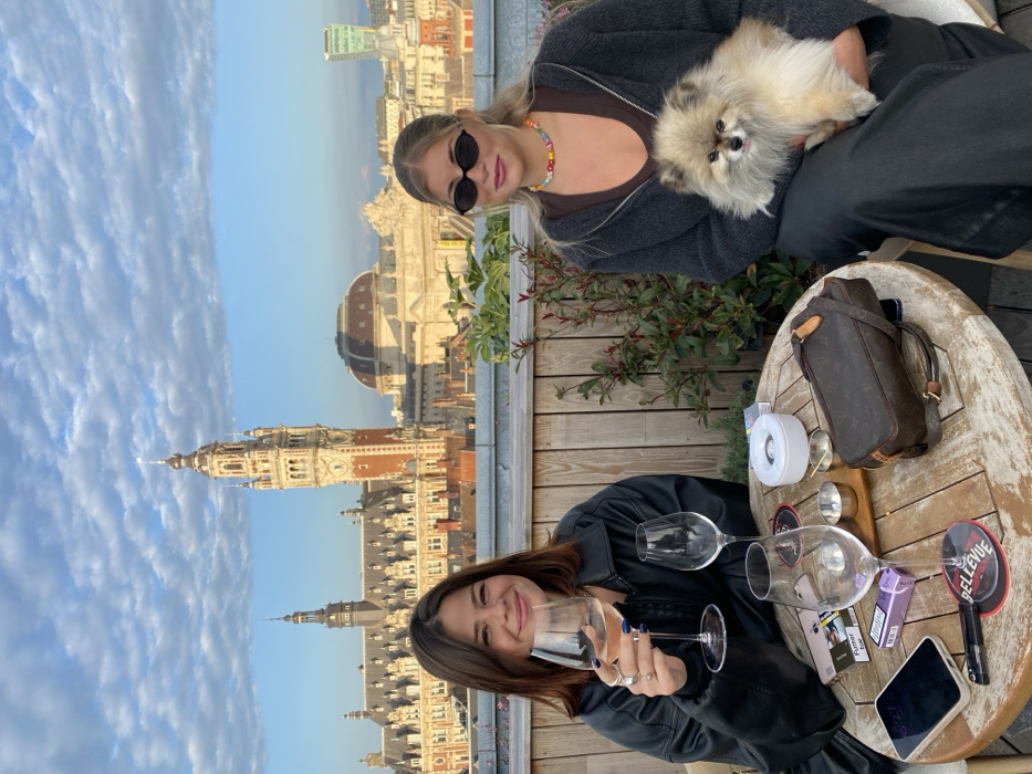 The image displays two women and a small dog at a round wooden table on a rooftop terrace in Lille, France