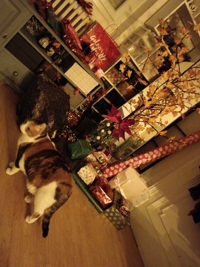 A tan, white, and brown cat sprawls on a wood floor near a collection of Christmas presents and decorations. The presents are wrapped in a variety of colorful papers. A small Christmas tree adorned with white bulbs and a red poinsettia sits among the gifts. In the background, a display of shelves with a shopping bag from Galeries Lafayette and autumn foliage are visible.