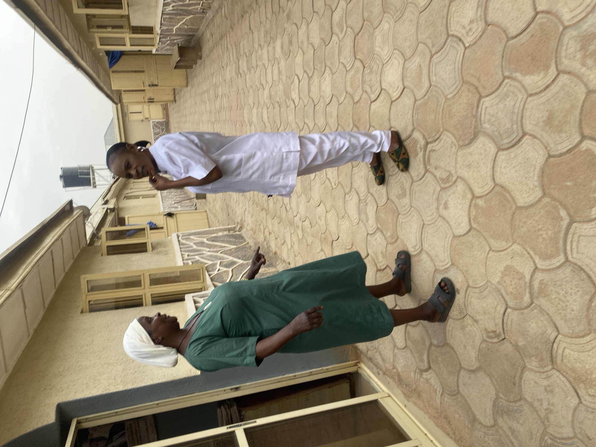 Two women are standing on a tiled walkway outside a building. One woman is wearing a white outfit and the other is wearing a green dress with a white head covering. The location appears to be in Rido, Nigeria.