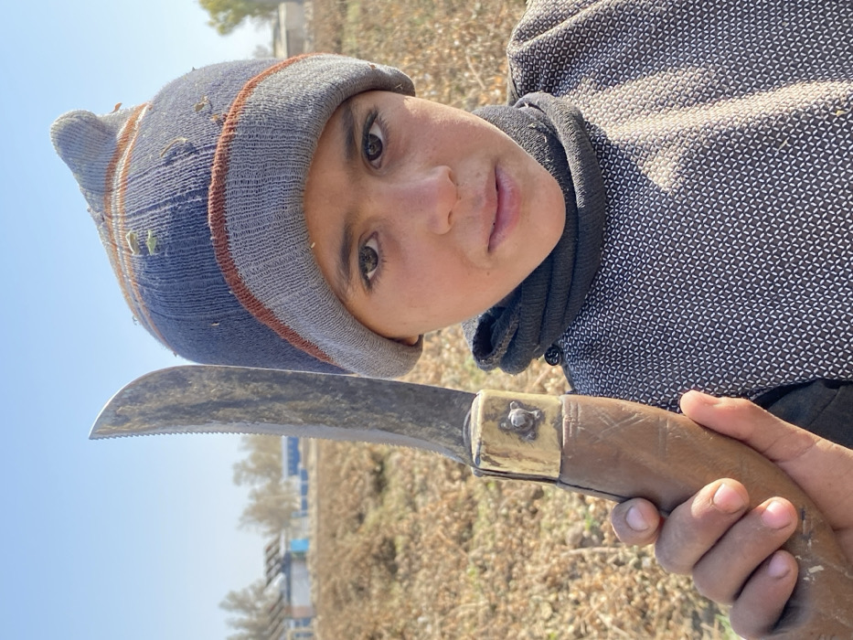 A young person wearing a blue and brown knit hat holds a large, rustic knife with a wooden handle and a serrated blade. The background is a field or agricultural setting with dry grass and faint structures. The person wears a patterned sweater and a dark turtleneck. The overall image has a grainy, sun-drenched appearance. The person's expression is neutral.