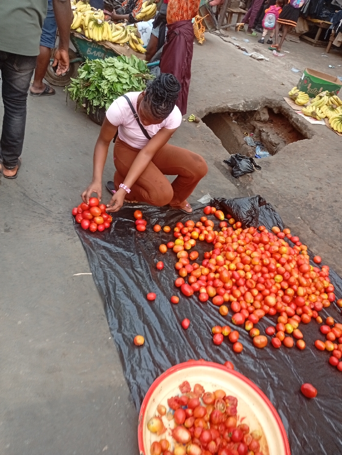 A woman with braided hair is crouched over a large pile of tomatoes laid out on a black plastic sheet on a street surface. She is sorting through them, placing some into a smaller pile next to her. There is a cart full of bananas and leafy greens in the background. Near the tomatoes is a large hole in the pavement. Other people and market goods like banana boxes are also visible. The ground appears worn and dusty.