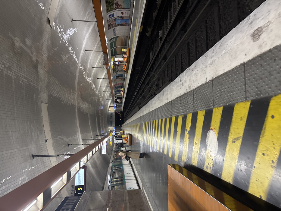 This image depicts an underground metro station on Line 5 of the Paris Metro, in Paris, France