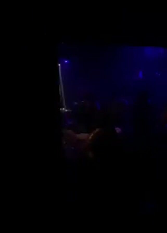 people dancing and partying in a dimly lit club. There are strobe lights and possibly smoke. The video is blurry, making it hard to see details of people's faces. There are glasses and bottles on the tables.