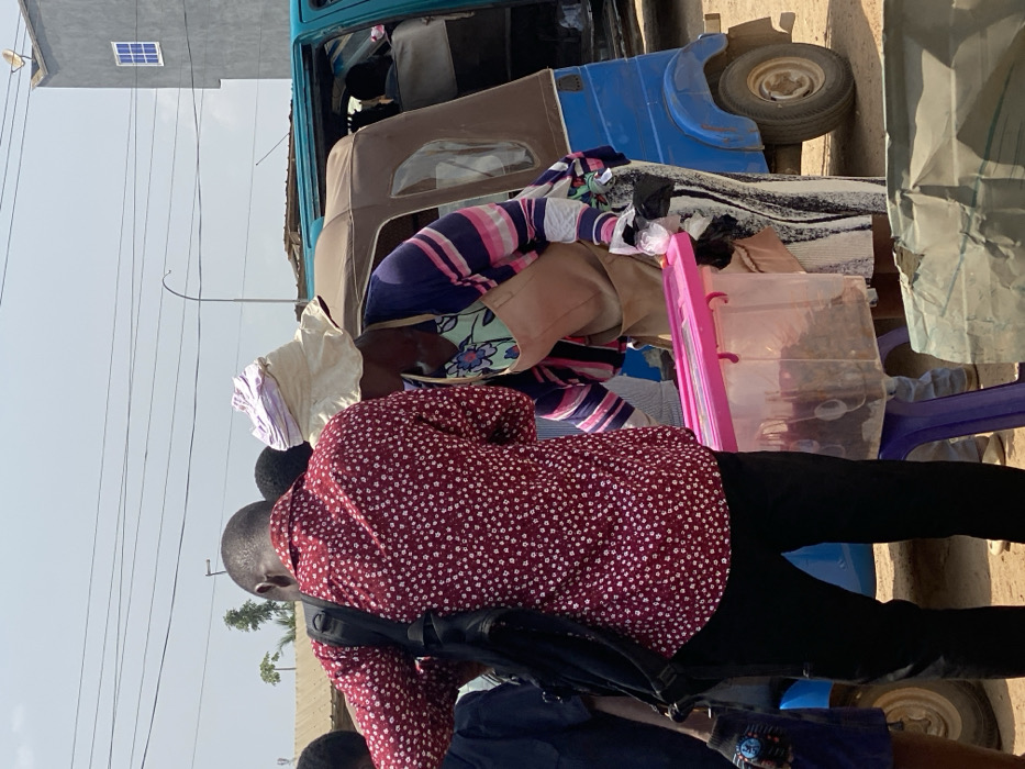 The image depicts an outdoor market scene in Ablekuma, Ghana, under a clear, bright sky. In the foreground, a male individual, viewed from the back, wears a red long-sleeved shirt with white polka dots and black trousers, carrying a black backpack on his left shoulder. He stands facing a female vendor. The vendor, positioned to the right of the male, wears a light-colored bucket hat with a gathered purple fabric top, a multi-striped long-sleeved top over a floral dress, and a light brown apron. She tends to a clear plastic container with a bright pink lid, which holds dark, granular contents and is placed on a purple plastic stool. She holds a small white plastic bag in her right hand, reaching into or towards the container. In the mid-ground, a blue three-wheeled commercial vehicle with a brown canopy roof is parked to the right of the vendor, with its side door open. A grey, unpainted building with a single blue-framed window is visible behind the vehicle. Overhead, numerous power lines crisscross against the sky. The ground beneath the subjects and vehicle is unpaved and appears dusty. Distant sparse green foliage and utility poles are visible in the background. The interaction suggests a transaction or preparation for sale between the vendor and a customer.