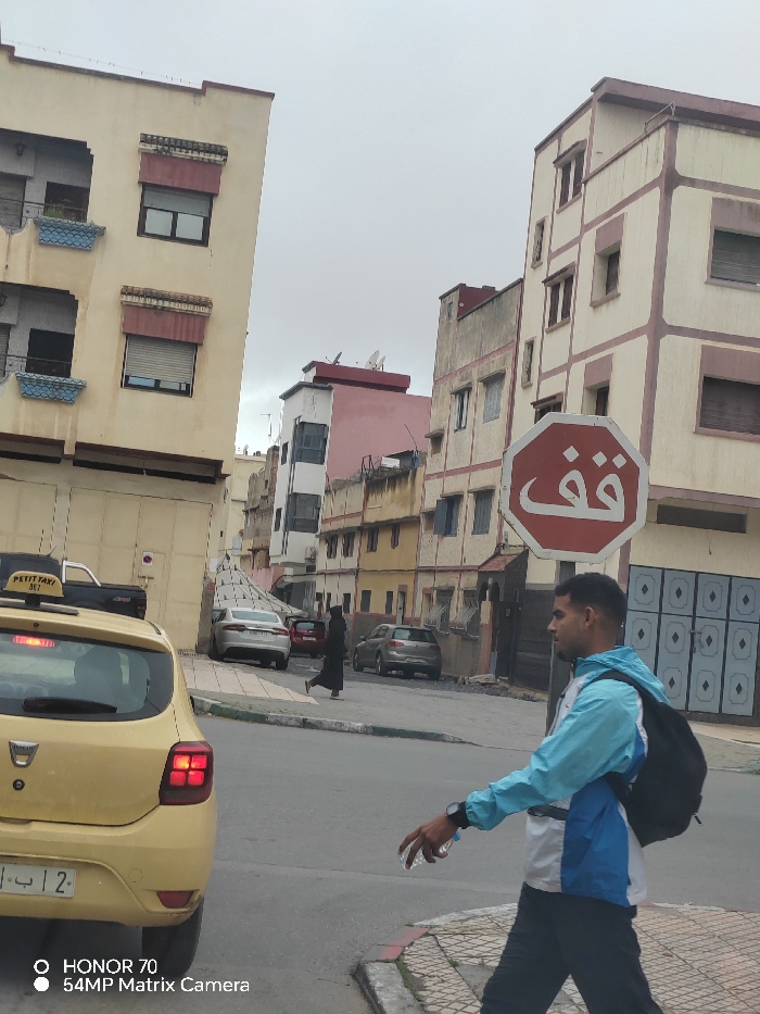 - "A street scene features a yellow "Petit Taxi" with Arabic writing on the license plate, a stop sign in Arabic, and a man with a backpack walking across the street" by FM-z9Q8u2, licensed under CC BY 4.0
