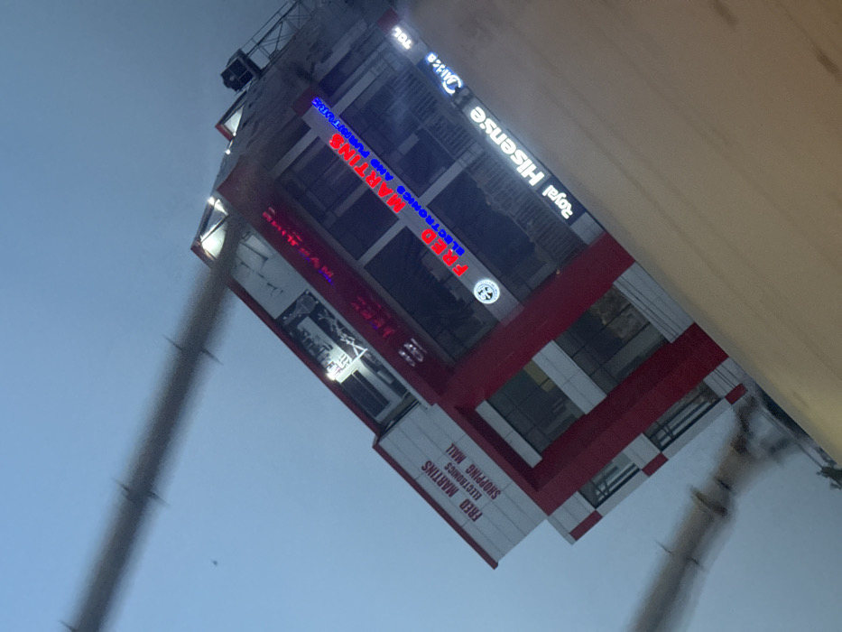 A tilted outdoor shot shows a building labeled "Fred Martins Electronics Shopping Mall." Above, the name "FRED MARTINS" is illuminated in red and blue lettering. Additionally, signs for "Royal Hisense" and "TCL" are visible. The building features red and white accents. The sky is visible in the background.