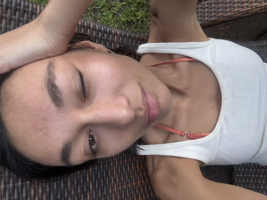 A forensic examination of the image reveals a female individual reclining outdoors in Hanalei, United States of America. The subject is depicted from a high-angle, close-up perspective, looking directly into the camera with a wink; her right eye is open, while her left eye is closed. Her right hand is placed on the upper right side of her head, partially obscuring her hair. She possesses dark hair, a medium skin tone, and prominent eyebrows. Her lips are slightly parted. The subject is wearing a white ribbed tank top over a coral-colored bikini top, the strap of which is visible over her right shoulder. A small, delicate gold-toned earring with multiple decorative elements hangs from her left earlobe. The background consists of a dark brown woven wicker chair or lounge on which she is resting. To the right of the frame, green grass is visible, confirming an outdoor setting under daylight conditions.