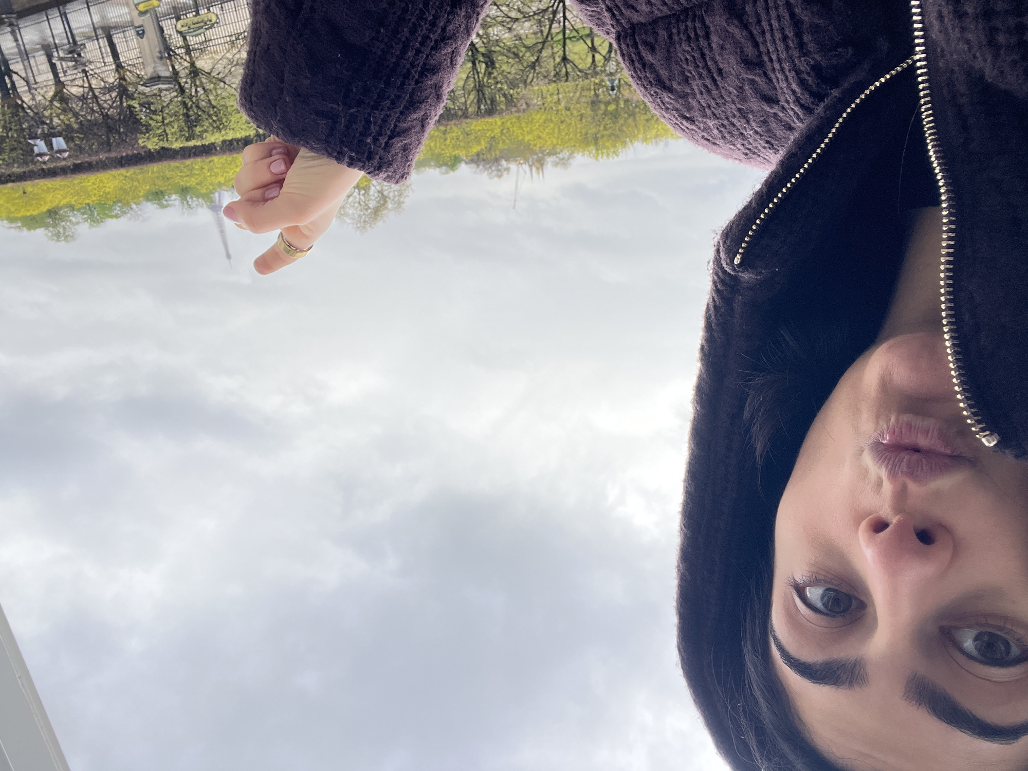 The image captures a selfie-style shot of a female individual with a Parisian cityscape in the background under an overcast sky