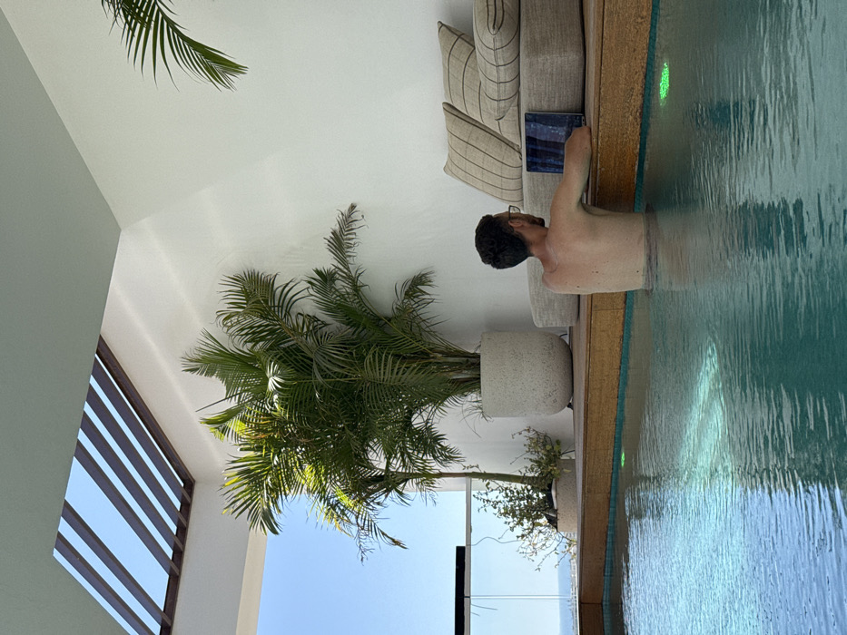 The image depicts an elevated outdoor pool area in Eilat, Israel, under a clear blue sky. An adult male, seen from behind and to the right, is partially submerged in the turquoise-blue water of an infinity-edge pool. He is shirtless, wearing glasses, and his forearms rest on the wooden deck surrounding the pool. A silver laptop is open on this wooden surface directly in front of him, and he appears to be interacting with it. To the right of the laptop, on a raised platform, sits light-colored modular outdoor lounge furniture with striped cushions. Further right and behind, a large palm plant in a light-colored, textured pot stands against a white wall. A smaller palm plant in a similar pot is visible to the left, near a clear glass railing that offers a distant view of the sea and city coastline. Overhead, a slatted wooden pergola structure is visible against the sky. A green LED light is illuminated underwater near the pool's edge.