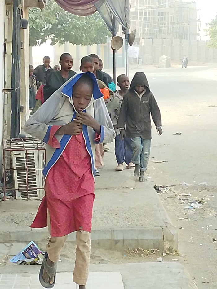 An outdoor scene in Babban Giji, Nigeria, depicts approximately ten individuals, primarily children and youths, walking along a sidewalk adjacent to a dusty street
