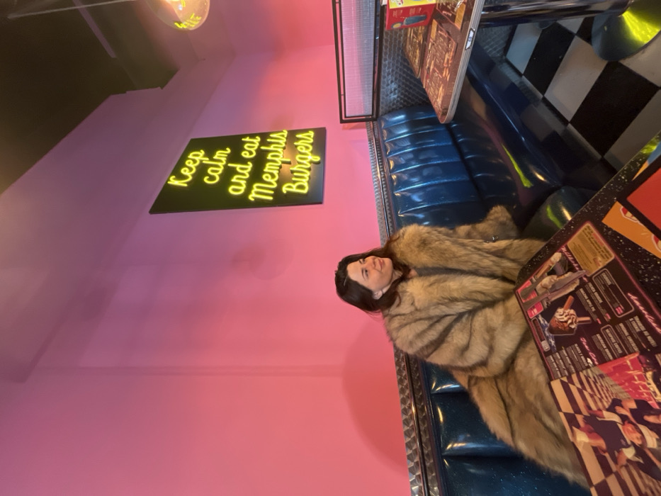 In a diner with pink walls, a woman wearing a fur coat sits in a blue booth. Above, a sign reads, "Keep calm and eat Memphis Burgers." A menu is on the table, partially obscuring the view. Black and white checkered floors are visible. The photo is taken at an angle, with the left side slightly higher. A light fixture is visible in the upper left corner.