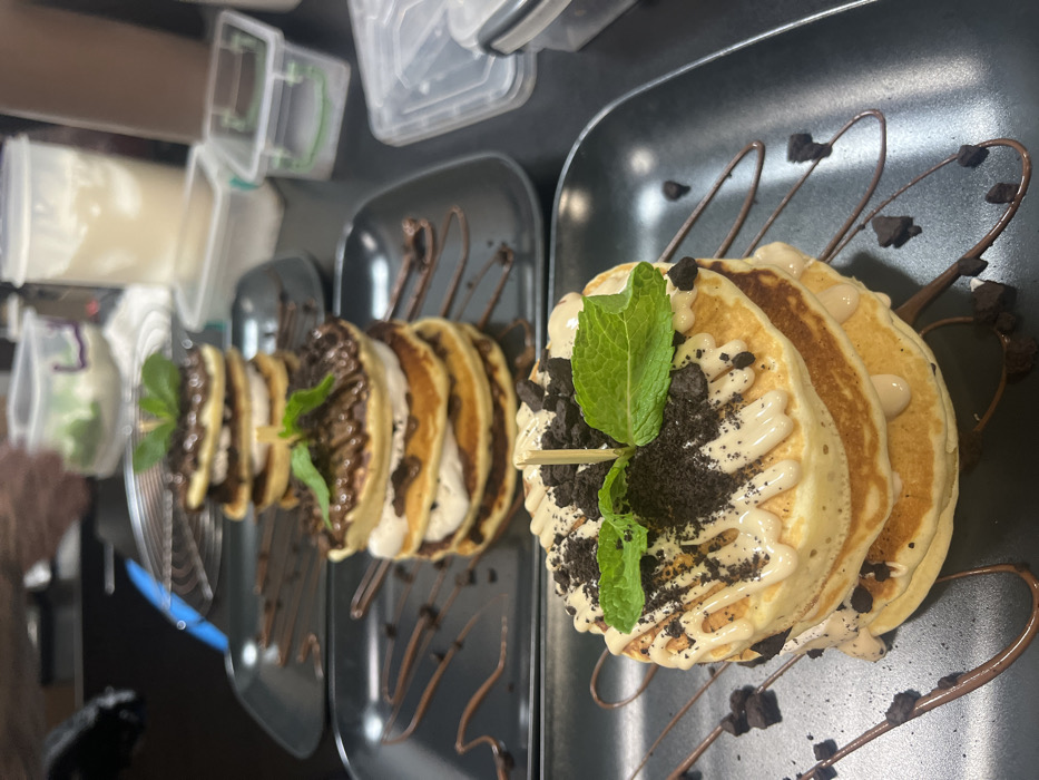 The image displays a food preparation area, consistent with a commercial kitchen or a cafe counter, located in Unknown, Unknown. Three individual servings of stacked pancakes, each on a black rectangular plate, are arranged in a diagonal line from foreground to background on a dark countertop. In the immediate foreground, a stack of four golden-brown pancakes is generously covered with a light, creamy sauce that drips down the sides. This stack is topped with dark, crushed cookie crumbs and garnished with two fresh mint leaves secured by a small brown toothpick. The black plate beneath is decorated with serpentine drizzles of dark brown sauce and scattered chocolate crumbs. Behind this, a second stack of four pancakes is visible, featuring layers of white cream between each pancake. The top pancake is covered with a dark brown sauce and dark sprinkles, also garnished with a single mint leaf and a toothpick. Its black plate likewise displays dark brown sauce drizzles. A third, less distinct stack of pancakes is partially visible further in the background, appearing similar to the second. In the upper left background, a person's hand, wearing a black glove, is partially visible, positioned near the plates, indicating ongoing food preparation or plating. The background environment includes various translucent plastic food storage containers on the dark countertop; one large container holds a light-colored liquid, and several smaller containers hold what appears to be green garnish or other ingredients. A metal kitchen utensil is also visible.
