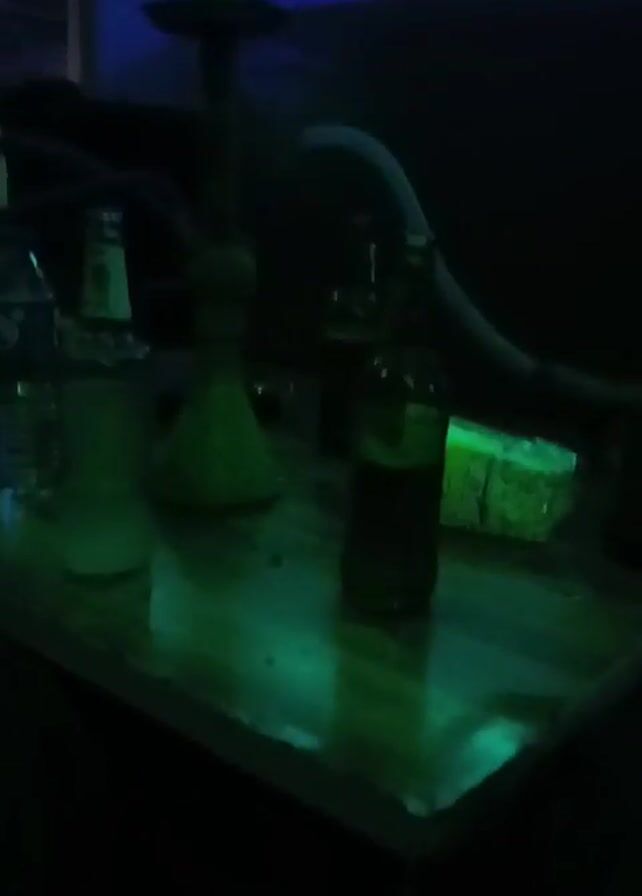 dimly lit room with colorful LED lighting, likely a lounge or hookah bar. There is a table in the center covered with drinks and hookahs. Two people are present, one wearing a white hat and the other dressed in white, both are sitting on a dark couch. The man in the white hat picks up what appears to be a lighter and looks at his phone. Music plays in the background.
