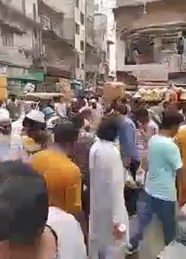 crowded outdoor market street scene. People are walking around, some carrying items. Buildings line the street, and there are stalls selling goods. The lighting is slightly dim, and the video appears to be taken from a handheld device. The overall atmosphere seems bustling and busy.