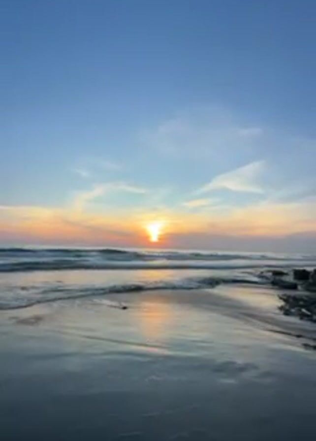 wide-angle view of a beach at sunset. The sky is a clear blue, with wispy white clouds near the horizon. The sun, a bright orange orb, is setting on the ocean, casting a golden reflection on the wet sand. Gentle waves lap at the shore. The foreground shows wet sand reflecting the sky and sun, while the edge of the frame on the right shows some rocks.