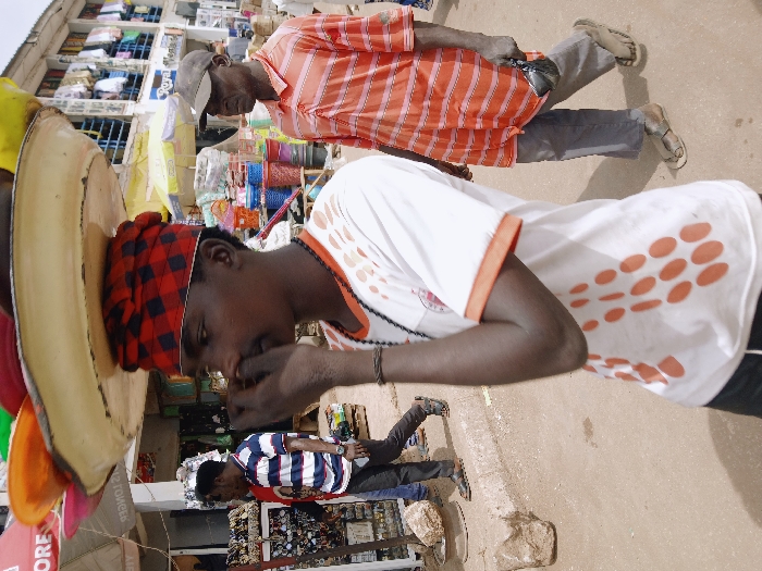 This image depicts a bustling street scene in Kwekwe, Zimbabwe, featuring multiple pedestrians and market stalls under daylight. In the central foreground, a dark-skinned male, wearing a red and black checkered headwrap, balances a large, light-colored metal basin containing various colorful plastic bowls on his head. He wears a white short-sleeved t-shirt with orange polka-dot patterns, a dark beaded necklace, and has his right hand raised near his nose. To the right of the central figure, an older dark-skinned male walks right, wearing a dark baseball cap, an orange and light-orange horizontally striped collared shirt, grey pants, and light-colored sandals. He carries a dark wallet or small bag in his left hand. To the left and further back, another dark-skinned male walks left, wearing a blue and white striped t-shirt and dark pants, passing a stall displaying various small items. The background shows multiple market stalls, with colorful plastic buckets stacked for sale on the right. Buildings with open windows and clothes hanging are visible, along with awnings, one partially labeled "Royal Water." The ground is an unpaved, light-colored dirt or worn concrete surface with a visible curb and scattered debris.