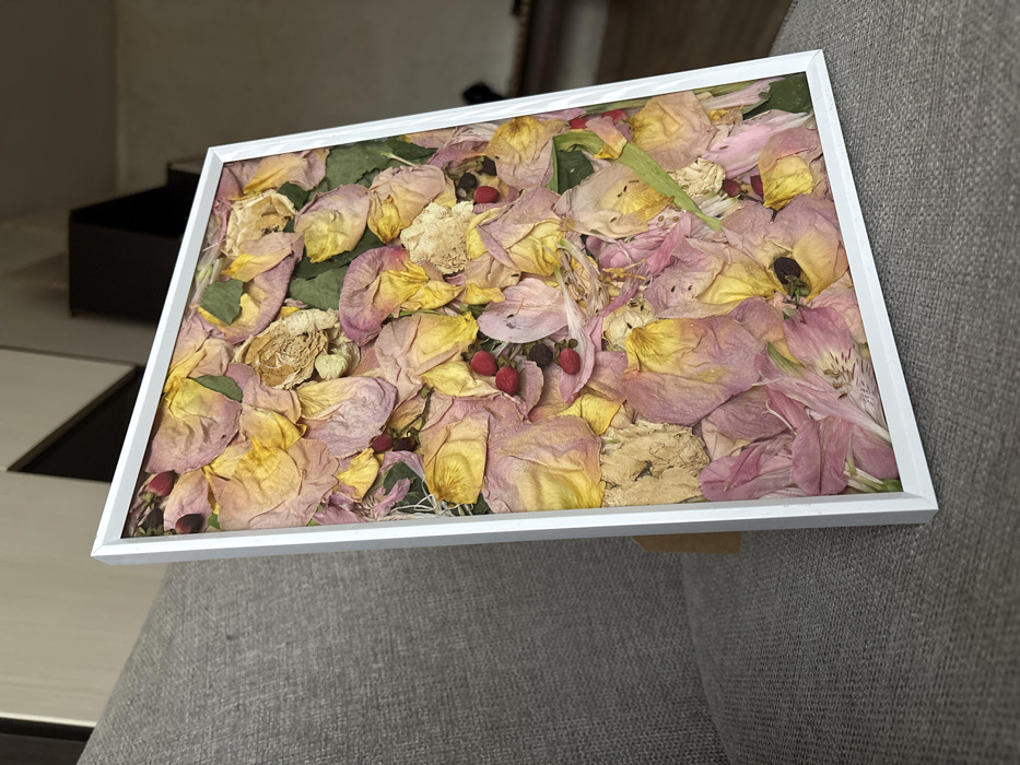 A white-framed shadow box, rectangular in orientation, rests at an angle on a textured grey upholstered surface, likely a sofa arm or cushion. The frame encloses a collection of dried botanical elements. The primary contents are densely packed, shriveled flower petals displaying shades of faded pink, mauve, yellow, and cream. Scattered throughout the petals are dried green leaves and several clusters of small, dark red, shriveled berries. The arrangement completely fills the visible area within the frame. A thin, light-brown support stand is partially visible behind the lower edge of the frame. The background is blurred, showing indistinct shapes of an indoor environment, including darker furniture elements and lighter wall or ceiling sections. No individuals are present, and no actions or interactions are depicted. This scene is located in Sofia, Bulgaria.