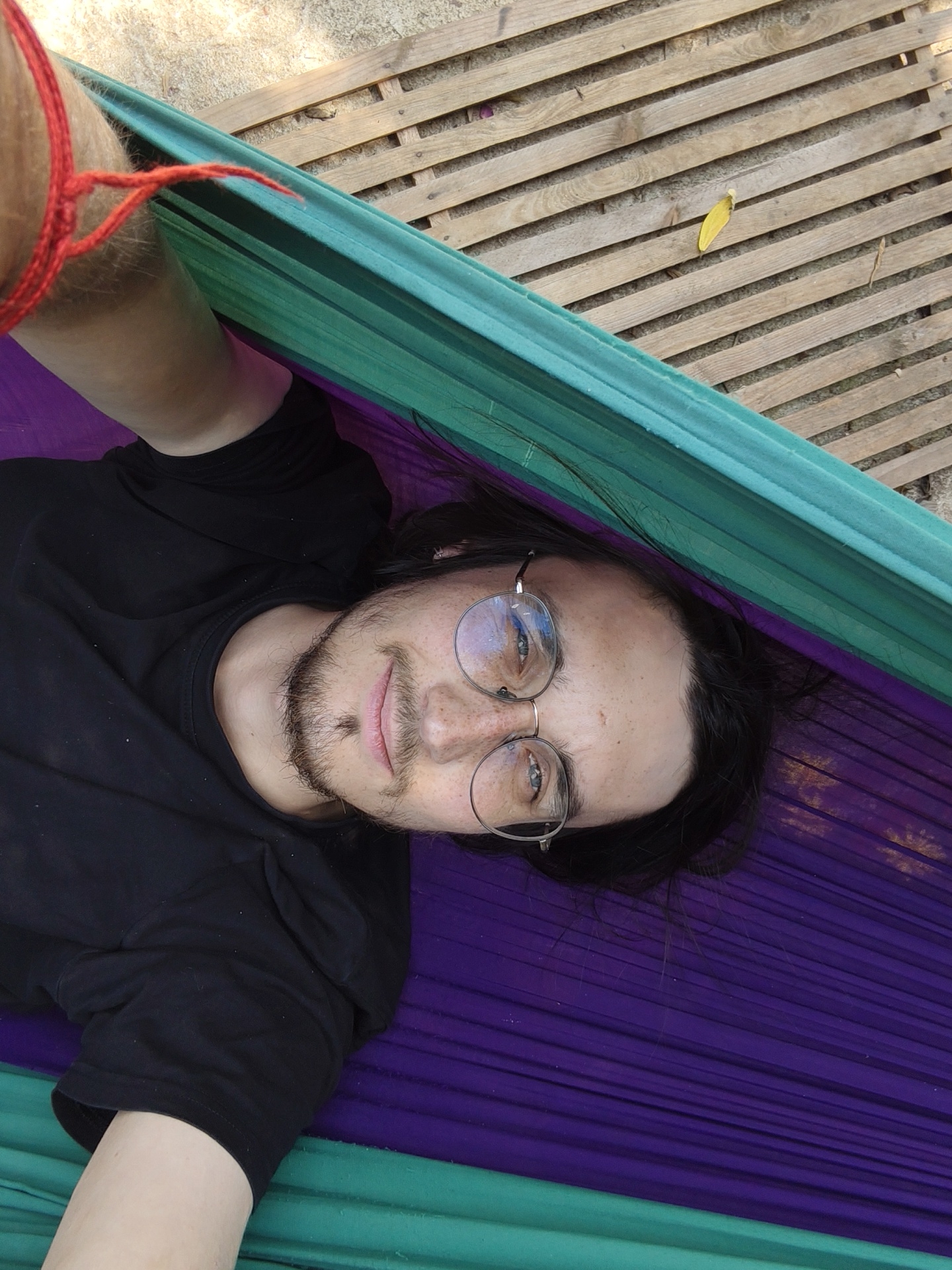 A person is depicted lying on their back in a two-tone fabric hammock, viewed from an overhead perspective, in an outdoor setting in Dalat, Vietnam. The individual has long dark hair, a goatee, and wears round metallic-framed eyeglasses. They are dressed in a black short-sleeved t-shirt. A red woven string or bracelet is visible on their right forearm. The hammock is primarily purple in the center with a green or teal border. In the upper right background, a light-colored wooden slatted surface is visible, with sandy or dirt ground interspersed between the slats. A single yellow leaf rests on the wooden slats. The individual is looking directly at the camera with a slight smile.