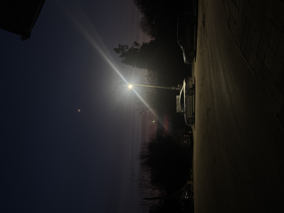 This image depicts a nocturnal street scene in Rabrovo, Bulgaria. The sky is dark blue with a visible crescent moon positioned in the upper left quadrant. A single bright street light, centrally located, emits a strong, directional beam of white light, illuminating the immediate foreground and two parked vehicles. To the left of the street light, a silver four-door sedan, possibly an Audi A7, is parked on a paved surface. To its right, a dark-colored SUV is also parked. A third, darker vehicle is partially visible further back and to the left of the silver sedan, under a less illuminated area. The ground consists of a paved road in the foreground and a sidewalk or edge with visible blocks on the far right. Beyond the parked cars, the background is dominated by a dense line of bare trees and shrubs, silhouetted against the dark sky. A faint reddish-orange glow is discernible along the lower horizon, suggesting either distant lights or residual twilight. No individuals are present, and no actions or interactions are observed. The scene is static, characterized by artificial illumination in an otherwise dark, likely urban or suburban environment. A dark structure, possibly part of a building or overhang, is visible in the upper right corner.